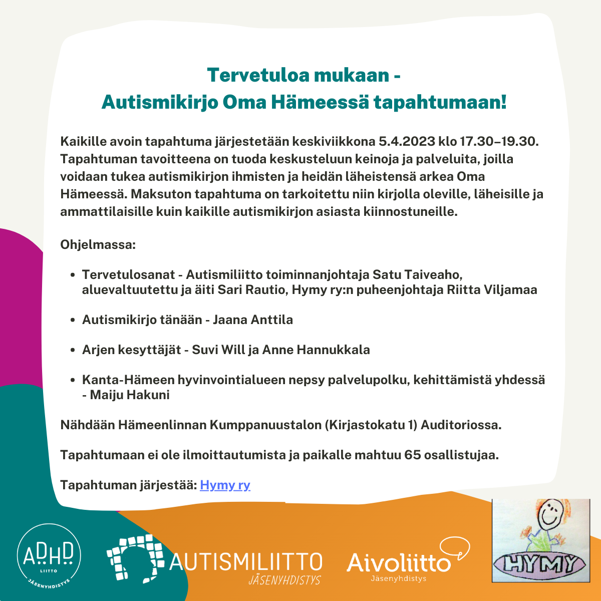Tule mukaan kuulemaan, keskustelemaa ja vaikuttamaan autismikirjon ihmisten ja heidän läheistensä asioihin Oma Hämeessä. Illan aikana jaetaan perustietoa autismikirjosta, kuullaan tuista ja palveluista ja arjen vinkeistä sekä keskustellaan ja vaikutetaan Oma Hämeen nepsy palvelupolkuun.